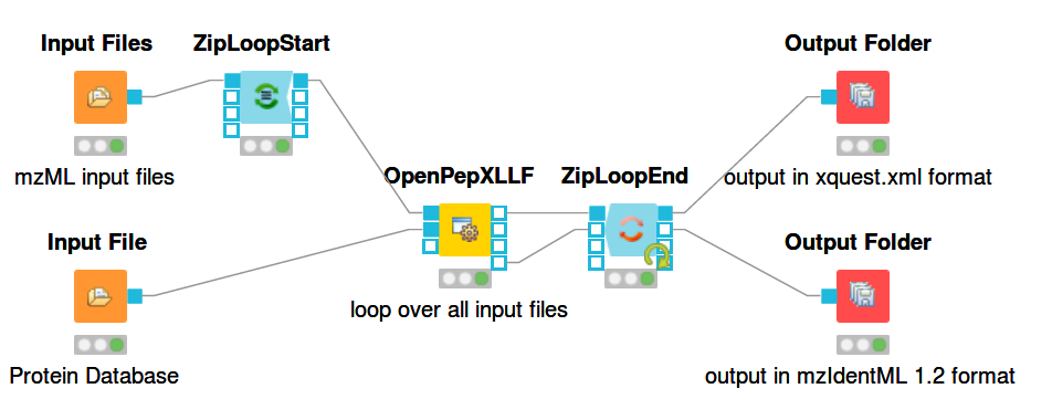 For reading in input files there are the nodes Input File and Input Files. Input File has one file path as its parameter and can be used for single files, like a protein database. The Input Files node takes a list of file paths for other nodes to iterate over. The ZipLoopStart and ZipLoopEnd nodes allow for a section of the workflow to iterate over multiple entries in a list. In this case FeatureFinderMultiplex and OpenPepXL or OpenPepXLLF are run multiple times, once for each input file defined in the Input Files node. The Output Folder nodes have a path to a directory as their parameter and write out all incoming data as files into that directory. The names of these files will be equal to the names of the mzML input files, but with a different file ending. The ZipLoopEnd node collects all the results of the loop before sending them further to the output nodes, so the results are written once after all processing is finished. Putting an Output Folder node inside the loop, e.g. right after OpenPepXL, will write out the results of the current input file right after OpenPepXL is finished with it. This type of workflow will go through the input files iteratively one by one and parallelization for each run can be set using the -threads parameter of OpenPepXL. To run a KNIME workflow, click on the green arrow button above the workflow pane.